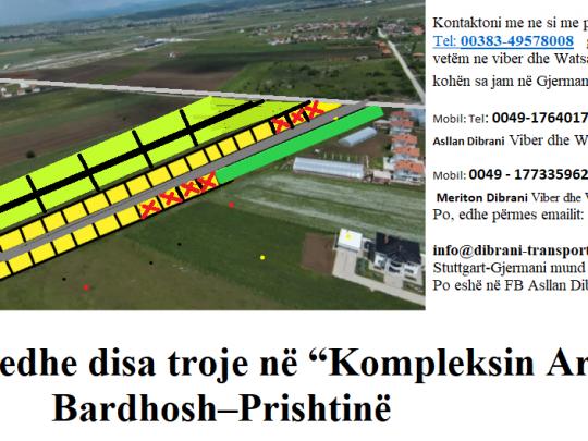 Shiten edhe disa troje në Bardhosh – Lagje e Prishtinës në “Kompleksi Arta “. Trojet janë të ndara sipas terrenit me sipërfaqe të ndryshme nga 3.5 deri në 4 ari .Ato qe ishin nga 5 ari janë të shitura. Kompleksi “Arta” gjenet në Bardhosh Lagje e Prishtinës, ku dita ditës është duke u shndërruar në një lagje moderne të Prishtinës me një infrastrukturë dhe plan në stil të shteteve perëndimore. Trojet shtrihen në kilometrin e katërt nga Prishtina në drejtim të Podujevës . Në fund të trojeve është edhe kanalizimi i ri i sistemit të qytetit nga e cila janë të lidhura edhe trojet tona. Çdo kush që e blen një truall ndërtimi aty, njëkohësisht pa pagesë i takon edhe një parcelë e përbashkët e vogël përafërsisht 1.6 ari sipas numrit rendor shihni ne skicën e ndarjes se trojeve qe është planifikuar për një kopsht të përbashkët familjar dhe për fëmijë. Kjo parcele gjendet në fund të trojeve majtas parcela e ngjitur me rrugën e lagjes. Deri me tash janë shitur 9 troje nga fillimi dhe në fund .Trojet kanë kanalizimin e ujerave të zeza me trashësi Fi 250,instalimin e rrymës po ashtu me kabllon e parapare industriale trashësinë Fi 120,dhe instalimin e ujë secili truall ka në brendësinë e vet. Rruga është lëshuar 6 metra gjerësi është me standarde evropiane. Është e shtruar me zhavorr dhe gur të bardh e përgatitur për asfalt dhe e ngjeshur me mjete të renda.