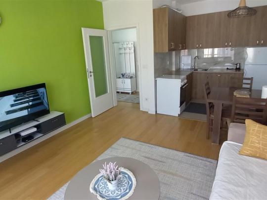 Banesa është e mobiluar në tërësi me te gjitha elementet funksionale dhe ka këtë renditje të hapësirave të brendshme; qëndrim ditor, kuzhinë, dhomë gjumi, një banjo, korridor dhe një ballkon.
