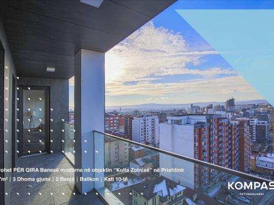 Në një prej objekteve më të mira të ndërtuara në Prishtinë siq është objekti "Kulla Zotnisë" jemi duke ofruar për qira këtë banesë mjaft të lezetshme, e mobiluar me shije, planimetri të shfrytëzuar, pamje të hapur nga qyteti, organizim perfekt dhe mundesi e artë për të gjith ata që preferojnë të jetojnë në një prej zonave më të banuara në Prishtinë.