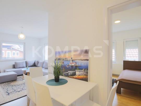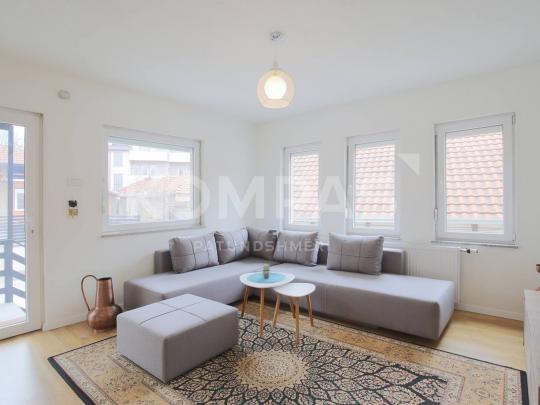 E sapo renovuar, me qasje private me shkallë të jashtme nga oborri, terasë rreth 30m² private, lokacion shume i mirë, lidhje të mira, dysheme laminat, roleta të jashtme. Pajisur me kuzhinë me të gjitha elementet. Ngrohje qëndrore elektrike.