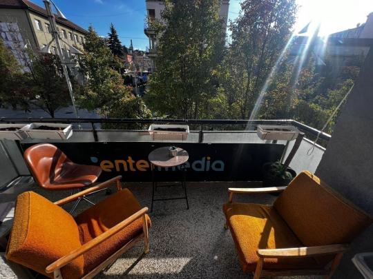 Ka hapësirë të mjaftueshme pune. Banesa ka tri hapësira të përshtaten për zyre, një kuzhinë, depo të dobishme për ruajtjen e materialeve dhe dokumenteve, një banjo dhe tre ballkona.
