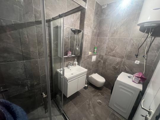 Banesa me qira, 87m2. Perberja e saj: dy dhoma gjumi dhe sallon me kuzhine, me dy banjo. Banesa posedon edhe garazhen.