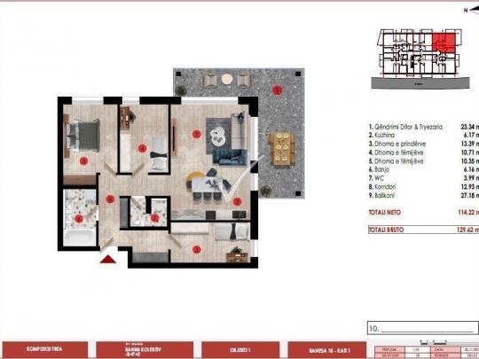 Renditja: | Sallon me kuzhine | 3 Dhoma gjumi | 2 Banjo | Ballkon dhe korridor |